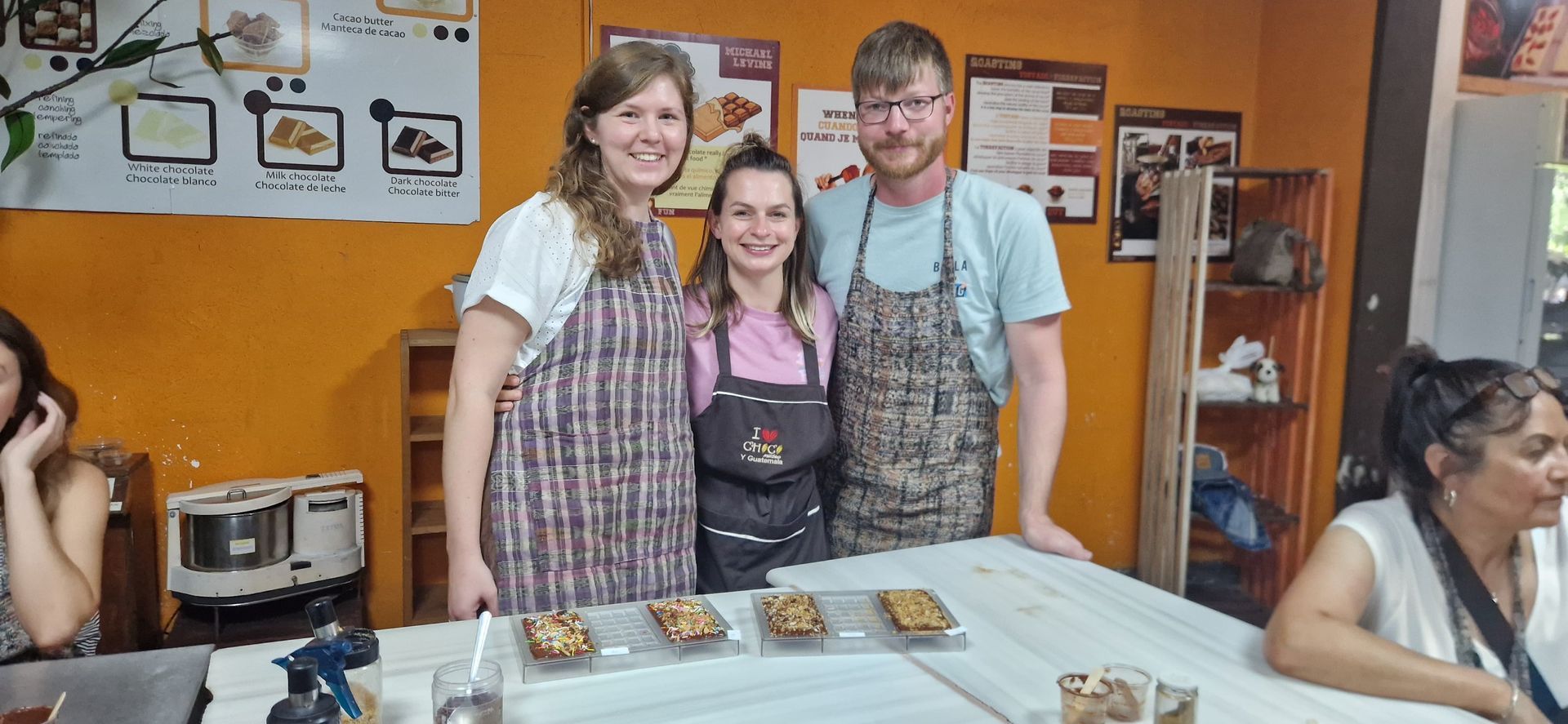 Während Pierre dann am nächsten Morgen ausschlief (und dann einen sehr süßen Geburtstagstisch vorbereitete), gingen Marie und Patty einen leckeren Kaffee in einem süßen Café trinken. Anschließend bummelten wir mit Muskelkater aus der Unterwelt gemeinsam ein bisschen durch die Gassen Antiguas. Die malerische UNESCO-Weltkulturerbe Stadt mit ihren pastellfarbenen Gebäuden, kopfsteinbepflasterten Straßen und hübschen Kolonialbauten erinnerte uns ein wenig ans Cusco. Nachmittags nahmen wir dann noch an einem Schokoladen-Workshop im städtischen Schokoladenmuseum teil. Dort hatten Frauke und Jo, zwei unserer witzigen Weggefährten, bereits morgens heimlich Bescheid gesagt, dass ein Geburtstagskind kommen würde und so wurde Patty mit vielen (!) Geburtstagsständchen und Schokokuchen überrascht. Anschließend hüpfte Pierre noch schnell zum Friseur, während sich Marie und Patty noch zum Cerro de la Cruz hochschleppten – einem Aussichtspunkt nördlich der Stadt auf einem Hügel, den man über viele Treppen erklimmen muss.