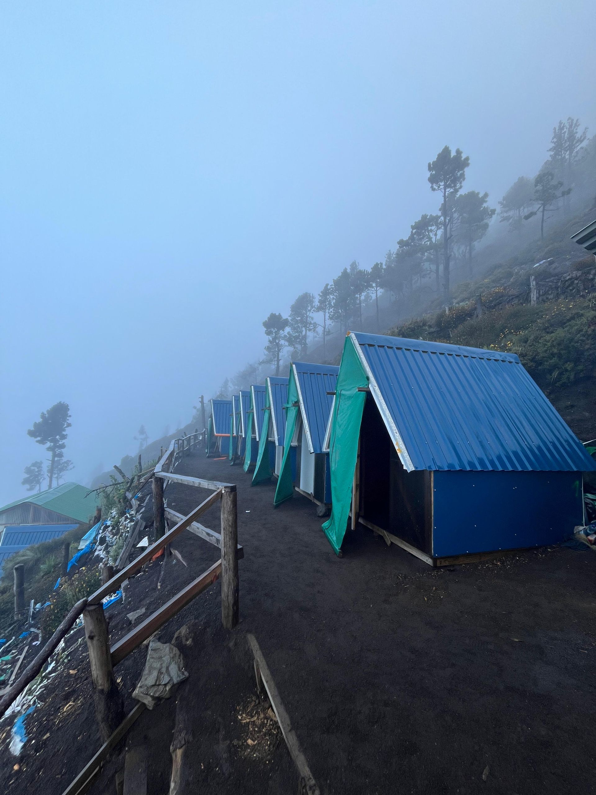Wir sammelten unsere letzten Kräfte und erreichten gegen 15 Uhr dann endlich das Basecamp! Wir liebten unseren Anbieter dafür, dass es dort kleine Hütten gab, die bereits mit Matratzen und Schlafsäcken ausgestattet waren. Andere Unternehmen stellen nämlich ausschließlich dünnwandige Zelte zur Verfügung: bei nass-kalten Temperaturen um den Gefrierpunkt haben wir gut darauf verzichten können. So richteten wir zunächst unser natürlich unbeheiztes Dreier-Bungalow ein und machten eine kurze Pause. Bei der Inspektion der Matratzen stellten wir dabei fest, dass das in der Mitte befindliche Exemplar nochmal gute 15 Zentimeter schmaler war, als die anderen beiden Unterlagen. Und während sich Pierre und Marie königlich auf ihren schier unendlich großen Betten wenigstens umdrehen konnten, musste Patty hingegen wie Graf Dracula schlafen. Danke für Nichts! Bis zu diesem Zeitpunkt hatten wir den Fuego übrigens nur Grollen hören – die dichte Nebelwand ließ einfach keinen Blick auf ihn zu. Als sich Patty dann nach der Pause zum Plumpsklo aufmachte, war es plötzlich so weit: der Nebel hatte ein Guckloch geöffnet und zum ersten Mal in ihrem Leben sah sie einen lavaspuckenden Vulkan. Ein echter Gänsehautmoment: so gefährlich und so beeindruckend zugleich. Die Anstrengung hatte sich tatsächlich gelohnt und abends verzog sich der Nebel dann tatsächlich auch für ein paar Stunden gänzlich. Das Abendessen wurde in der verrauchten Gemeinschaftshütte um eine Feuerstelle herum serviert. Es gibt typisch guatemaltekisches Essen, nichts Besonderes, aber es ist warm, mit Liebe gekocht und macht satt. Währenddessen sitzen wir am Lagerfeuer und unterhalten uns mit den anderen Wanderkumpanen. Als Nachtisch gibt es zwischen den Vulkanausbrüchen noch Marshmallows und eine heiße Schokolade. Das tut richtig gut, denn es wird bereits unangenehm kalt hier oben. Unser Kleidungs-Schichtsystem mit den ausgeliehenen Sachen funktionierte bei uns Dreien recht gut und wir schliefen auch alle mehr oder weniger erstaunlicherweise in Ordnung.