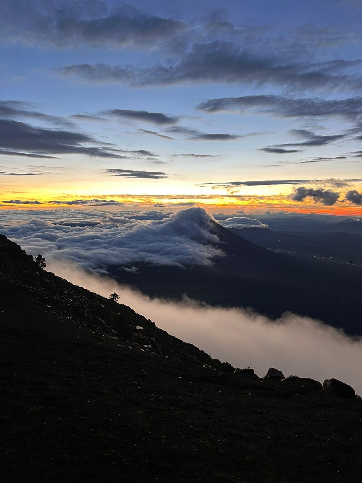 Morgens - naja, obwohl… es war eher nachts - um 3:50 Uhr klopften dann die Guides mit einem lauten „Vamos“ (Los geht’s!) an die Hütten. Tja , wer einen Sonnenaufgang über den Wolken will, muss eben leiden. Und so wartete ein weiterer anstrengender und steiler Aufstieg zum Gipfel auf uns. Und auch wenn es „nur“ knapp 400 Höhenmeter waren, wirkte dieses ca. 1-stündige Sportprogramm im Dunkeln (nur mit einer Stirnlampe ausgestattet) und ohne Kaffee eher wie ein nächtlicher Albtraum. Und trotz der Anstrengung war es wunderschön, den Fuego in dieser sternklaren Nacht ab und zu Feuer spucken zu sehen. Keuchend am Gipfel des Acatenango auf fast 4000 Höhenmeter angekommen, wurden wir dann von den ersten wunderschönen Sonnenstrahlen begrüßt. Nach all den Strapazen fühlte sich die Atmosphäre so weit oben einfach wie von einer anderen Welt an. Bei all der Magie dort oben hätten wir fast vergessen, dass es verdammt kalt und extrem windig war – wir hatten das Gefühl, fast auf den Fuego geweht zu werden. Und urplötzlich tauchte die Nebelwand wieder auf. Unsere Guides riefen uns entsprechend eilig wieder zusammen und leiteten den Abstieg ein. Wir warfen noch Frodo-ähnlich – zumindest gedanklich - den verdammten Ring in den feuerspuckenden Krater und gingen zurück ins Base Camp. Mittlerweile schenkte uns das noch müde Tageslicht ein wenig Sicht und so düsen wir durch den feinen schwarzen Vulkansand abwärts zu unserem Frühstück. Nach den überraschend guten Pancakes und einem nur medium leckeren Kaffee, packten wir unsere sieben klammen Sachen zusammen und machten uns auf den Rückweg – im heute strömenden Regen. Joa und Überraschung: wenn es steil bergauf geht, dann geht es leider auch steil bergab – man könnte es auch einfach als „knieunfreundlich“ betiteln. Und während wir am Vortag zu den soliden Mittelwanderern gehörten, führten wir an diesem Morgen das Geschwader an - langsam runter laufen ging einfach nicht. Obwohl wir recht rasant unterwegs sind, landete nur Marie ein Mal auf ihrem Allerwertesten - anders geht es da den Sneaker- und Turnschuhträgern, die unsanft den Berg hinunterschlittern. Ein Hoch auf unsere Wanderschuhe! Nach der letzten Pause kann Patty nicht anders: die verbleibenden 20 Minuten rannte sie die nasche Asche runter – unten wartete schließlich ein kühles Bier auf alle Überlebenden. Nach insgesamt 3 Stunden Abstieg hatte uns der Startpunkt wieder: verregnet, verschwitzt, verdreckt und überglücklich! Wir hatten die wohl bislang schwierigste Wanderung unserer Leben lebend hinter uns gebracht. Lächelnd prosteten wir uns zu und verabredeten uns mit einigen lieben Mitwandernden zu einem abendlichen Umtrunk – Patty würde schließlich um Mitternacht Geburtstag haben. Zu diesem Zeitpunkt war sich zwar niemand so sicher, ob man nicht vorher in einen tiefen Winterschlaf fallen würde, aaaber der Wille war da. Nachdem wir dann unsere ausgeliehenen, nicht mehr ganz frischen, Sachen zurückgegeben hatten, wurden wir mit dem Bus wieder zurück nach Antigua gebracht, wo wir dann alle erstmal für eine laaaange Zeit unter der Dusche verschwanden. Ein wirklich einmaliges Abenteuer liegt nun hinter uns… und jetzt wollen wir wirklich nichts mehr von diesen Höhen wissen – Frodo kann seinen Sch**** in Zukunft selbst machen – haha.