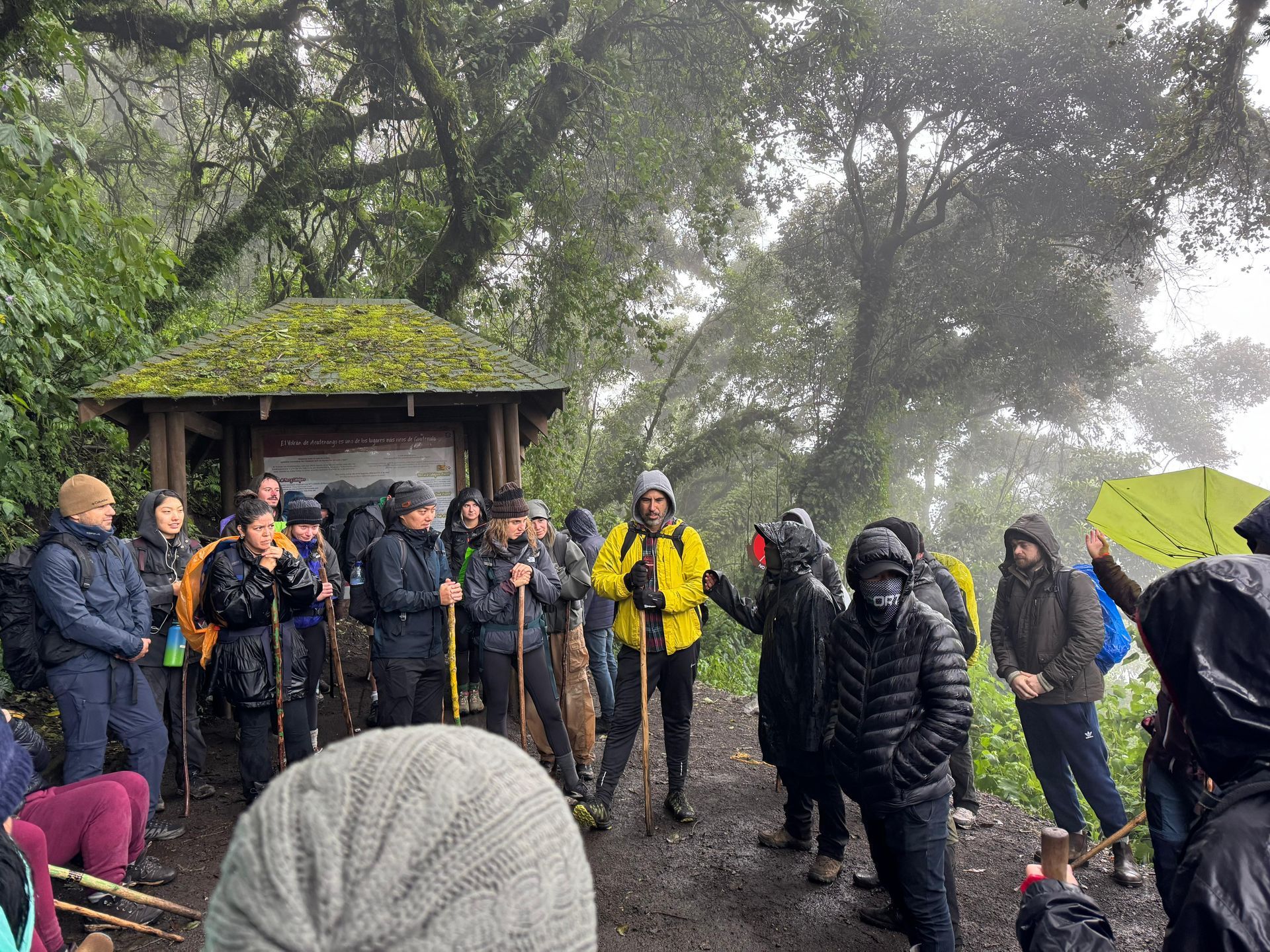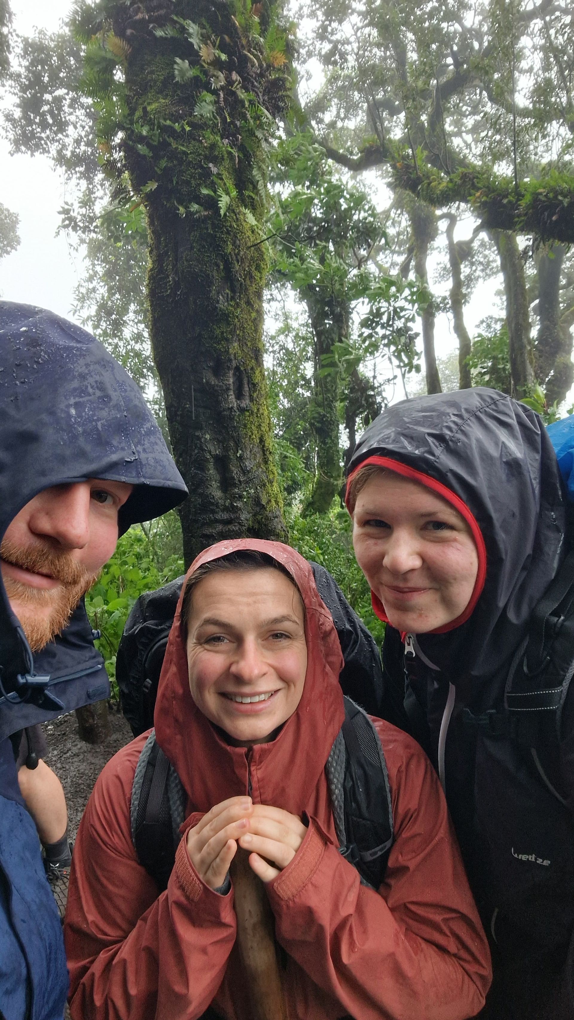 Und wie sollte es anders sein? Es ging direkt steil nach oben – ein Einstieg ohne Gnade. Ein Gespräch mit den Mitstreitenden war (zumindest uns) nicht mehr möglich, jeder Gedanke wurde direkt im schweren Keuchen erstickt. Und so kämpften wir uns auf dem feuchten und sandig-rutschigen Untergrund den extrem abschüssigen Vulkan empor. Und wer jetzt denkt, dass es – so wie bei gefühlt allen anderen Wanderungen – auch mal gerade Teilstücke gibt, den müssen wir enttäuschen: die ersten 4 Stunden es ging ausschließlich (!) bergauf. Nach einer Stunde fing es dann auch an zu nieseln, sodass sich unsere Gruppe recht schnell in eine Regenjacken-Armada verwandelte. Nach knapp 2:30 Stunden legten wir einen längeren Halt ein und mampften gemeinsam unsere Lunchpakete. Es war trotz der Nässe und der Anstrengung schön zu sehen, dass niemand (so wirklich) nach Aufgeben aussah, sondern sich alle irgendwie gemeinsam da hoch kämpfen wollten. Und formten sich irgendwie bereits unterwegs ein paar Vulkan-Freundschaften, die auf gegenseitigem Motivieren basierten. Nach der Stärkung marschierten wir dann weiter und summten ab und zu die Titelmelodie von „der Herr der Ringe“, bevor wir dann wieder bitterlich nach Luft rangen. Je höher wir kamen, desto anstrengender wurde es – mal wieder fehlte merklich der Sauerstoff, sodass sich jeder Schritt anfühlte, als würde die Lunge gleich aus dem Brustkorb platzen. Aufgrund der Wolken und des dichten Nebels konnten wir während der gesamten Wanderung übrigens weder die vermutlich tolle Aussicht, noch den Vulkan Fuego sehen. Und so fragten wir uns, ob sich diese verdammte Anstrengung überhaupt lohnen würde… Die letzte Stunde führte dann nur noch leicht(er) bergauf und bergab – denn dort führte der Weg recht eben um den Acatenango herum. Dort oben wurde es dann merklich kühler und auch die Landschaft deutlich kahler.