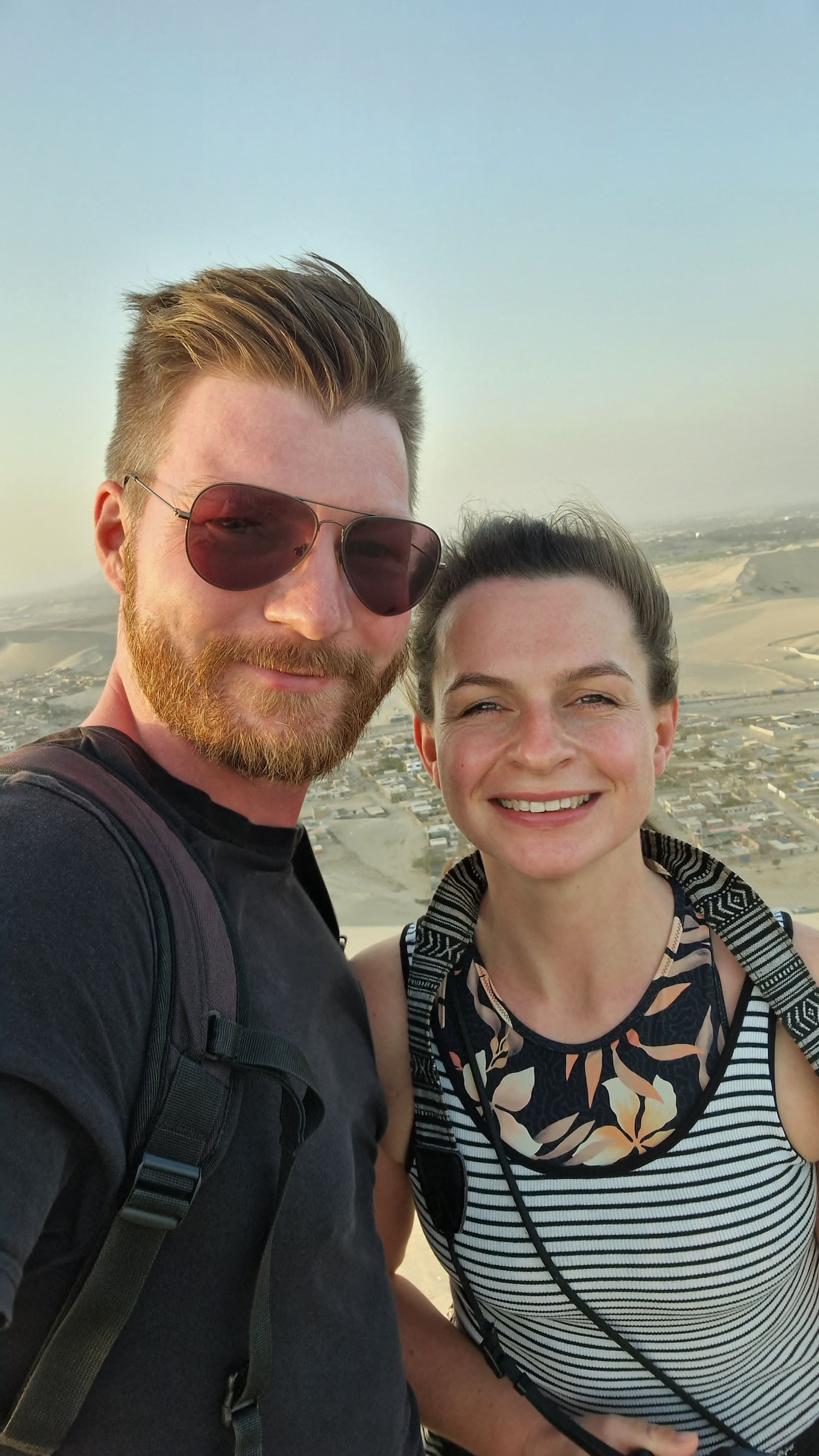 Nach dieser trinkfreudigen Episode wurde uns plötzlich klar: Die Zeit rennt! Unser Plan, den Sonnenuntergang über den Dünen von der Wüstenoase Huacachina zu sehen, rückte in ernste Gefahr. So schnappten wir uns schnell ein Taxi, warfen die Weinflasche im Hotel raus, stopften unsere Pullis in den Rucksack und ließen uns von einem Tuktuk mit gefühlten 200 km/h (okay, vielleicht waren es 30) durch die staubigen Straßen Icas bis zum Eingang des Wüstendorfes bringen. Dort suchten wir uns die größte Düne aus, die wir finden konnten, und starteten den Aufstieg. So wie auch in Namibia war das Unterfangen durch den losen Wüstensand natürlich wieder viel anstrengender, als es aussieht, aaaber wir haben es zum Sonnenuntergang geschafft – ein wirklich schöner Anblick! Da oben war es aber auch extrem windig, sodass wir fast zu lebendigen Sandburgen wurden. Also beschlossen wir, dass es genug Wüstenerlebnis für einen Tag war. Beim Abstieg trennten sich die Geister: Patty rannte lachend den Hang hinunter, als gäbe es keinen Morgen, während Pierre, mit einem frischen Tattoo auf der Haut, ein langsames Waten wählte. Nach diesem Mini-Abenteuer war der Verkehr in Huacachina und Ica so verstopft, dass wir kurzerhand beschlossen, zur Pizzeria vom Vortag zu laufen. Denn eines hatten wir hier auch schnell festgestellt: kulinarische Hochgenüsse sucht man hier vergeblich. Pizza geht zum Glück immer und so endete unser Tag mit der italienischen Spezialität und einer Menge Sand in den Schuhen.
