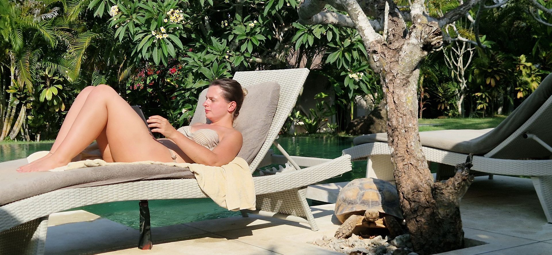 So, aber von vorn: Um geographisch für's Surfen gut zu wohnen, wurde uns das Dörfchen Kuta empfohlen. Kuta befindet sich an der Südküste und uns wurden schöne Unterkünfte, moderne Restaurants/Cafés, günstige lokale Warungs (einfache lokale Restaurants), tolle Massagestudios, Rollerverleihe und Boutiquen sowie ein weiterhin vorhandener authentischer Insel-Vibe versprochen. Klang erstmal toll. Da wir nach dem gemäßigten Klima in Japan jedoch nicht wussten, ob und wie lange wir die schwüle Hitze wieder ertragen können und wollen und wie uns Kuta gefallen würde, buchten wir zunächst nur vier Übernachtungen. Jetzt sitzen wir 2 1/2 Wochen später noch immer hier und ihr könnt euch die Frage, ob es uns gefällt, vermutlich selbst beantworten. Für die, die den Eintrag jedoch nur mit dem halben Gehirn lesen: Wir finden es suuuper hier! Fairerweise müssen wir aber festhalten, dass wir hier keinen sonderlich großen Reiseradius hatten. Und auch wenn die Insel viel zu bieten hat wie z.B. wunderschöne Wasserfälle, Traumstände, einen zu besteigenden Vulkan, traditionelle Dörfer und noch vieles mehr, haben wir die Gegend rund um Kuta nicht wirklich verlassen. Nachdem wir in den letzten Monaten ausschließlich Rundreisen in den von uns besuchten Ländern gemacht haben, war uns einfach nach einer Pause. Und so waren wir auch hinsichtlich der Unterkünfte wenig abwechslungsreich: Die ersten Nächte verbrachten wir in einem tollen Hotel namens Rascals, dann ein paar Nächte im 1 Minute entfernten Jivana, wo freilebende Riesen-Schildkröten auf uns warteten, bevor wir dann für die letzten Tage wieder zurück ins Rascals gingen. Nach unserem Besuch im Jivana wackeln unsere Backpacks übrigens wieder mal ungewöhnlich stark und verschlingen einen Salatkopf nach dem anderen... merkwürdig.
