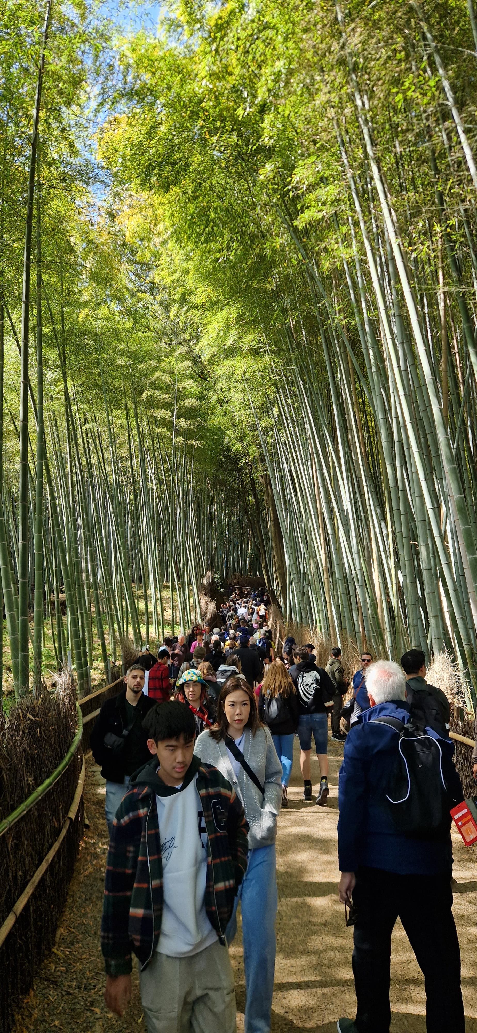Eine der Hauptattraktionen der Stadt ist der Pfad durch den Sagano Bambuswald. Ein Reiseführer schreibt: "Stellen Sie sich vor, Sie blicken auf einen endlosen Pfad mit schwankenden grünen Zweigen. Die Stängel ragen weit über Sie hinaus und lassen das Sonnenlicht sanft eindringen. Der Wald scheint sowohl zu Ihrer Linken als auch zu Ihrer Rechten endlos zu sein. Das Geräusch von Laub, das in der Brise schwankt, wiegt Sie in einen tranceartigen Zustand. Vielleicht sind Sie in diesem Moment allein, oder vielleicht können Sie in der Ferne freundliche Menschen in Yukata-Kleidern und Getasandalen sehen. Diese friedliche Szene ist kein bloßer Traum – im berühmten Arashiyamas Bambuswald kann diese Szene Realität werden." Wir sagen dazu nur: Hahahah... haha... Also klar, der Weg durch den Bambuswald ist für uns europäisch geprägten Tannenbaum-Kennende sicherlich was Schönes, aber jetzt bestimmt kein Orgasmus für alle Sinne. Und schon gar nicht ruhig und beschaulich. Nicht kurz nach Sonnenaufgang, ganz bestimmt nicht zur Mittagszeit und auch nicht abends. Während Pierre die Menschenmassen übrigens immer ganz gut ausblenden kann, zählt das nicht zu Patty's Fähigkeiten. Während sie also von den anderen Reisenden durch den Wald geschoben wurde, gab sie ihr unnützes Wissen zum Thema Bambus von sich: "Da die Pflanze schnell wächst, wurde sie noch bis zum Zweiten Weltkrieg zur Folter eingesetzt. Das Opfer wird dazu auf einem Bambusspross fixiert, der dann in den Körper hineinwächst, die Organe schädigt und schließlich tötet." Anschließend liefen wir noch zu einem weiteren, sehr kurzen Bambusweg im Tempel Adashino-Nenbutsuji, der als Geheimtipp galt. Wir halten auch hier fest: Das Geheimnis ist zwar alles andere als geheim, aber es war trotzdem ganz schön. Am besten war jedoch der 20-minütige Spaziergang durch kleine Dörfchen, um vom einen Bambuswald zum anderen zu gelangen. Wir liefen durch die Sonne an kleinen Geschäften vorbei, in denen hauptsächlich Tee, Blumensteckkunst und zahlreiche Töpfereiformen angeboten wurden.