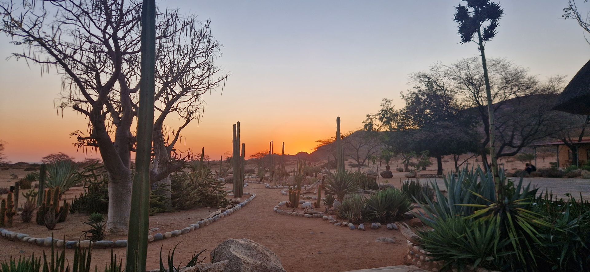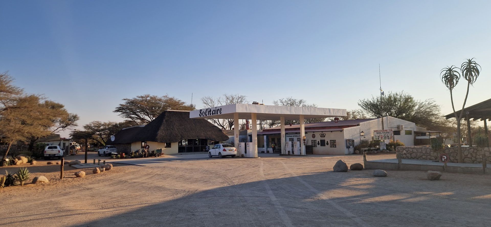 Was leicht als eine verlassene Tankstelle in der staubigen Wüste durchgehen kann, ist in Wirklichkeit alles andere als einsam. Es handelt sich nämlich um den wirklich einzigen Ort, an dem man auf dem Weg von Sossusvlei nach Walvis Bay oder Windhoek anhalten und auftanken kann. Und so gilt das Örtchen seit 1949 als ein belebter Boxenstopp für Reisende. Zum Glück kamen wir dort unter, denn die dort befindliche Bäckerei verkauft einen wirklich leckeren Apfelkuchen und zaubert einen guten Kaffee - vielleicht waren wir dort also sogar gleich zwei Mal für eine Mittagspause anzutreffen. Die auf dem Gelände herumstehenden alten Autoskelette, die veraltete Zapfsäulen und der Wasserturm haben bei uns einen kleinen Wilder-Westen-Moment ausgelöst, sodass wir nur noch auf vorbeifegende Heuballen gewartet haben. Da wir nicht direkt am nächsten Morgen in die Wüste losfahren wollten, vertrieben wir uns den ersten Tag mit einer Wanderung in der Umgebung. Da die freundliche, aber orientierungslose Rezeptionistin die vorhandenen Wanderwege jedoch nur so medium gut voneinander unterscheiden konnte, schickte sie uns einfach mal selbstbewusst in die völlig falsche Richtung los. Nachdem wir dann 1 ½ Stunden zwar einem Weg gefolgt sind, aber weder die versprochenen Markierungen noch eine Ähnlichkeit zu der von uns geplanten Route feststellen konnten, liefen wir einfach wieder zurück – die Sonne ging nämlich bereits unter und in der Dunkelheit wollten wir auf keinen Fall in der namibischen Bergwüste unterwegs sein. So wie immer in solchen merkwürdigen Situationen, nahmen wir es mit Humor – schließlich wollten wir uns ja einfach bewegen und das hatten wir letztendlich ja auch geschafft. Sichtlich peinlich berührt, fragte die Rezeptionistin nach unserer Rückkehr, ob wir den „richtigen“ Weg vielleicht am nächsten Tag laufen wollen, aaaber wir mussten dankend ablehnen, da wir bereits andere Pläne hatten.