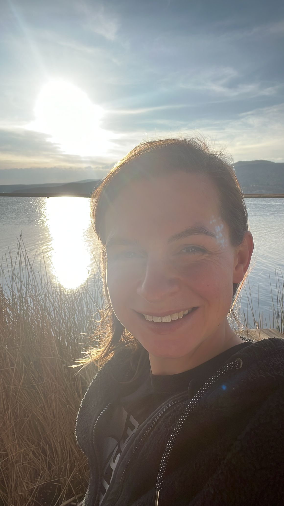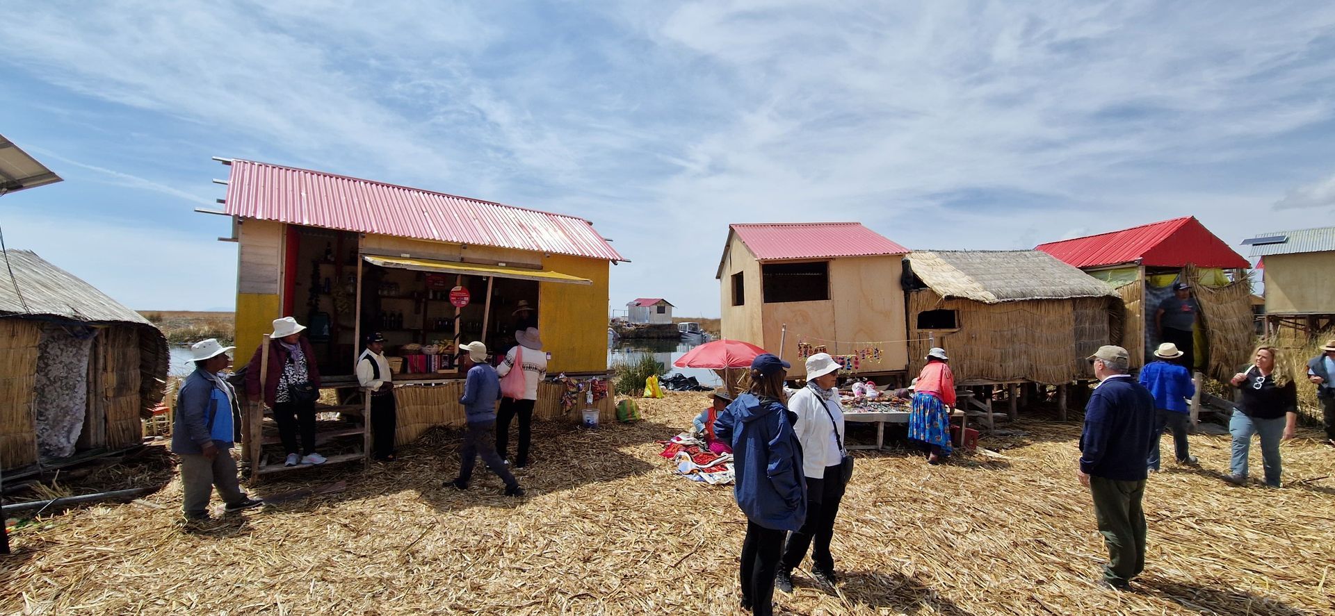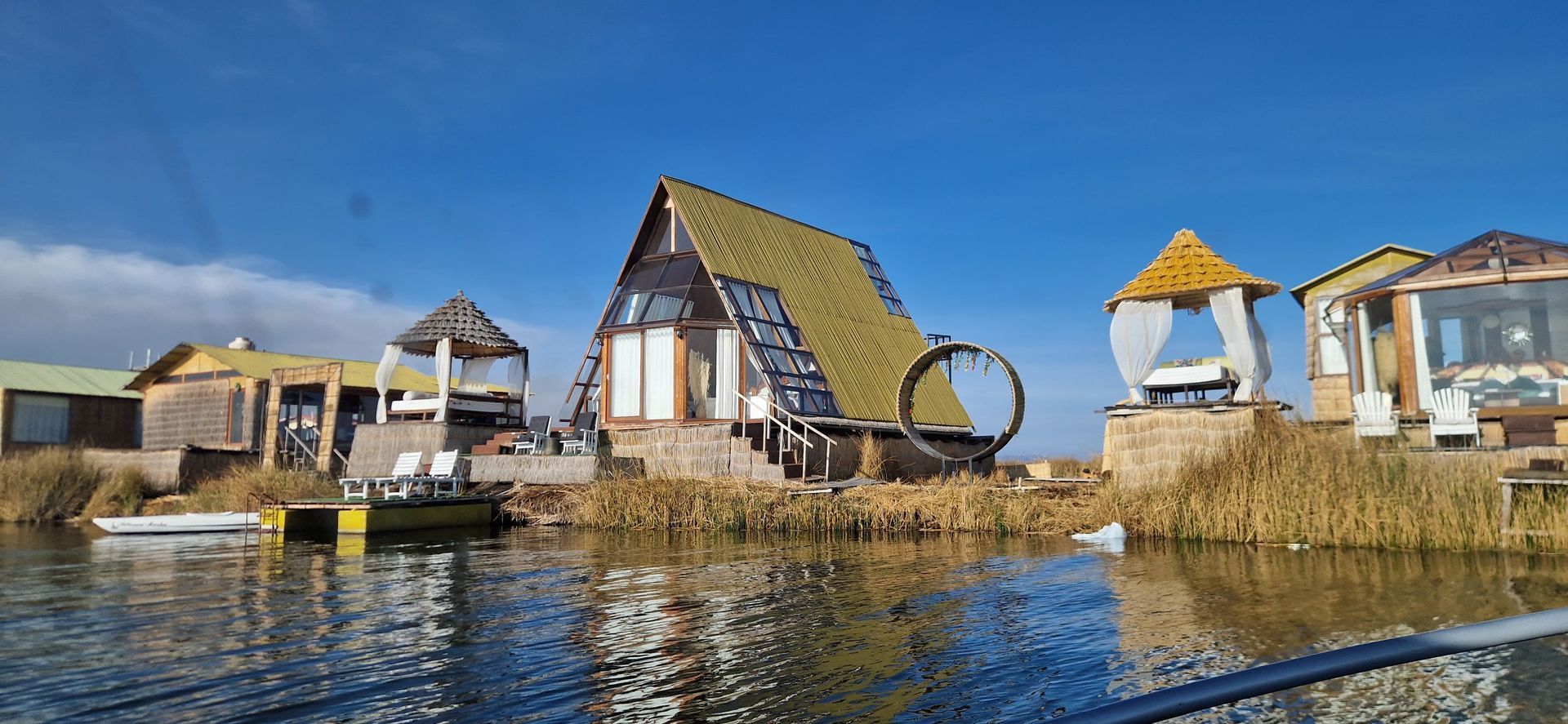 Nun aber zurück zu uns: nachdem uns unser Taxifahrer an einem unscheinbar anmutenden, runtergerockten Hafen rausgelassen hatte, stiegen wir auf ein kleines, motorisiertes Boot um. Unser freundlich lächelnder Kapitän bot uns an, dass wir uns für einen besseren Blick auf das Dach setzen dürfen und so hüpften wir aufgeregt hoch. Bei strahlendem Sonnenschein passierten wir so die ersten Schilfgrasinseln, während kleine Fischerboote leise tuckernd unseren Weg kreuzen und bunt gekleidete Frauen mit einer Machete Seegras am Ufer ernten und es zu tragbaren Paketen bündeln. Wir fühlen uns mal wieder wie eine andere Zeit zurückversetzt und waren irgendwie schon in diesem Moment froh darüber, dass wir diesen idyllischen Abstecher zum Titicaca-See gemacht hatten. Nach einer 15-minütigen Fahrt übers Wasser erreichten wir unser Ziel: eine kleine Insel mit drei Unterkünften, von denen eine unser Zuhause für die nächsten zwei Nächte sein sollte. Die schwimmenden Inseln bestehen übrigens vollständig aus Totora-Schilf, das in großen Mengen am Ufer des Sees wächst. Aber wie baut man eigentlich eine Insel, die auf dem Wasser schwimmt? Der Bau beginnt mit dicken Schichten von Schilfwurzeln, die wie riesige, schwimmende Matten auf der Wasseroberfläche treiben. Mehrere dieser Wurzelmatten werden miteinander verknotet und mit Seilen verbunden, um eine stabile Grundlage zu schaffen. Dann wird die Oberfläche der Insel mit mehreren Schichten frischen Schilfs bedeckt. Die so gebauten Inseln sind nicht nur schwimmfähig, sondern auch stabil genug, um ganze Schulen darauf zu errichten. Wenn wir so an unsere mehr oder weniger erfolgreichen Floßbauversuche in der Kindheit zurückdenken, fast unvorstellbar. Der einzige Nachteil: das Schilf muss ständig erneuert werden, weil die unteren Schichten im Wasser langsam verrotten.